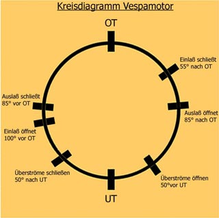Jetzt messen wir noch einmal von neuem. Wir stellen wieder den obersten Todpunkt ein. Das geht jetzt sehr einfach, weil der Kolben am obersten Todpunkt ganz oben steht. Wir markieren uns wieder die Stelle bei genau Null Grad. Jetzt drehen wir wieder langsam im Uhrzeigersinn. Und was sehen wir bei genauer Betrachtung? Genau! Wenn wir jetzt drehen öffnet sich der Einlass bei ca. 55° nach OT und wenn wir weiter im Uhrzeigersinn drehen sehen wir, dass sich der Auslass bei ungefähr 85° nach OT öffnet. Das kann man einfach sehen, in dem man von oben in den Zylinder blickt und wartet bis der Auslass öffnet. Wenn wir jetzt weiter drehen und weiterhin von oben in den Zylinder schauen, sehen wir das sich bei ca. 50° vor UT die Überströmkanäle öffnen. Wie kann das sein? Die Überströmkanäle sind geöffnet während der Auslass offen ist? Sehr komisch! Das hat einen einfachen Grund. Der Zweitakt Motor braucht den Spüleffekt des Frischgases. Einfacher ausgedrückt könnte man sagen, dass das Altgas (das verbrannte Benzin Luftgemisch) durch das neue von dem Unterdruck angesaugte Frischgas, welches über die Überströmkanäle in den Brennraum gelangt aus dem Auslass gespült wird. Das dabei etwas Frischgas mit in den Auspuff gespült wird, lässt sich nicht vermeiden. Auf die Verlustleistung eines Zweitaktmotors wegen des Spüleffektes will ich jetzt aber nicht genauer eingehen! Also braucht der Motor diese Überschneidung der verschiedenen Kanäle, um überhaupt richtig funktionieren zu können. Wenn wir jetzt weiter drehen, kommen wir zum UT. Jetzt drehen wir weiter und bei ca. 50° nach UT schließen sich die Überstömkanäle wieder. Wenn wir weiter drehen sehen wir, wie vorhin, das sich der Einlass bei ca. 100° vor OT (oder 80° nach UT) öffnet. Als nächstes sehen wir, dass sich der Auslass bei ca. 85° vor OT schließt. Nun sind wir wieder bei unserem OT angelangt. Um jetzt möglichst viel Leistung aus dem Motor kitzeln zu können sollte man diese Werte gewissenhaft erhöhen. Wenn man ein Tuning Kit von Polini oder Malossi montiert brauch man sich um die Werte der Überströmkanäle keine großen Gedanken zu machen. Diese sind meistens für Normalsterbliche völlig in Ordnung. Man kann aber zwecks Leistungserhöhung diese Werte ebenfalls ändern. Das sollten aber nur erfahrene Tuner tun. Außerdem ist eine Bearbeitung der Überstömkanäle im Zylinder keine einfache Sache und die Kanäle sind meistens schwer zugänglich. Allerdings sollte man darauf achten, dass alle Modifikationen Auswirkungen aufeinander haben. Es hilft zum Beispiel nichts, wenn man den Auslass im Zylinder riesig groß macht, ohne den Einlass dementsprechend zu vergrößern. Wenn der Motor nur eine bestimmte Menge Frischgas bekommt, kann er auch nicht mehr verbrennen, oder besser aus dem Auslass rauslassen. Jede Modifikation am Einlass und Auslass Trakt sollte synchron durchgeführt werden. Zur Veranschaulichung habe ich mal ein kleines Kreisdiagramm erstellt.