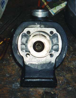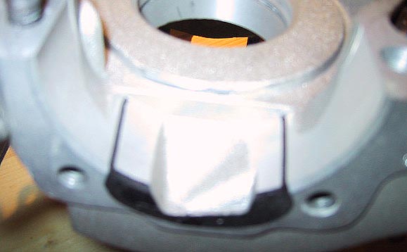 Erst einmal braucht ihr einen Filzstift. Dann könnt ihr eure Kanäle etwa nach den Bildern aufmalen, oder besser, ihr schneidet gleich eine Dichtung und legt diese dann auf den Zylinder und auf das Motorgehäuse. Wenn ich den Motor dann endgültig fertig habe, könnt ihr euch die Dichtungen hier runterladen und ausschneiden. Es ist übrigens immer besser zuerst das Motorgehäuse zu überarbeiten und dann den Zylinder, weil man so besser sieht, wie groß man die Kanäle überhaupt machen kann. Natürlich solltet ihr auch genau darauf achten das der Zylinder genug Dichtfläche hat, sonst habt ihr vielleicht ein Gehäuse, das zu groß für euren Zylinder ist. Also aufpassen und lieber 10mal nachmessen. Wenn ihr am Gehäuse aufgeschweißt habt ist das eigentlich eher unwichtig, aber ohne aufschweißen sollte man schon genau ausloten wie weit man gehen kann, bis man ein Loch im Gehäuse hat. Es gibt nichts schlimmeres als ein schönes originales Gehäuse, das durch unsachgemäßes drauflos Fräsen nur noch zum wegschmeißen taugt! Schaut euch die Bilder mal an. So war es vorher.