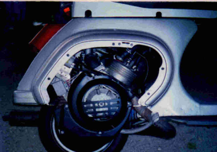 Basis des Motors waren ein PKXL Motorgehäuse mit langer Dichtfläche, ein 133ccm Polini Rennzylinder, ein 30mm Dell' Orto mit selbstgedrehtem Ansaugstutzen, eine ETS-25mm-Rennwelle, ein abgedrehtes PK Lüfterrad. Das ganze war um 180° Grad gedreht, d.h. dass der Zylinder um 180° gedreht wurde und man dadurch einen besseren Auspuff fahren kann. Außerdem wird dadurch die Zylinderkühlung verbessert. Die Übersetzung entsprach der einer PK 125/PV. Als Kupplung diente eine normale 3 Scheiben Kupplung mit zusätzlicher 4 Scheibe, die auf der einen Seite vom Korkbelag befreit wurde. Es kam des weiteren eine Doppelfeder von Eurocylindro zum Einsatz. Das Gehäuse wurde am Einlass bis auf wenige Millimeter komplett geöffnet, so dass die Dichtheit des Drehschiebers gewährleistet war. Das könnt ihr auch auf dem Bild sehen. Mehr ging nicht.