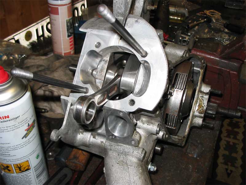 Ich werde also den Auslaß auf 185° bringen, so dass ich auf einen Vorauslass von 30° komme. Sollte ganz gut laufen! Als Vergaser habe ich mir nun einen 30er TMX geholt, und werde diesen mit einem selbstgedrehten Drehschieberstutzen fahren. Zündung wird sich so bei 17-19° einpendeln. Gerade so viel, dass er nicht klingelt. Abblitzen ist natürlich klar. Die Kurbelwelle habe ich auf 208° Einlasszeit mit Gehäuse gebracht, und wie das Polrad vom Worbel wuchten lassen. Jetzt sollte der Motor auch noch einigermassen ruhig laufen. Tja....beim Auspuff warte ich noch auf den Norrie Kerr Auspuff, wenns mit dem nichts wird, dann wirds wohl ein VSP oder JL gedreht werden. Habe die Kanäle im Zylinder symmetrisch gemacht, also kann ich auch gedreht fahren.